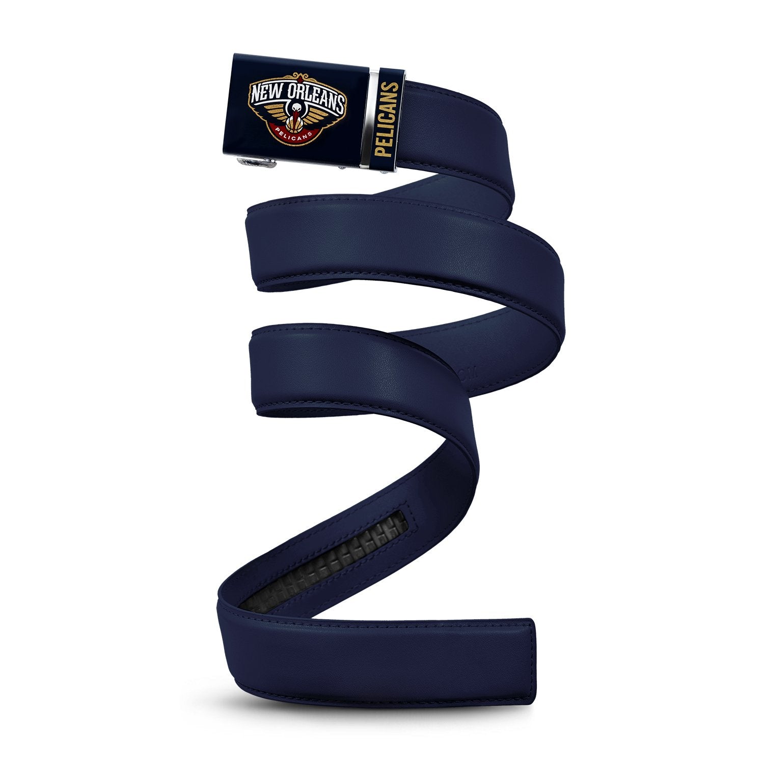 The officially licensed New Orleans Pelicans Belt from Mission Belt Co. features an imprinted team logo and team name on the buckle under a clear acrylic finish. Genuine leather strap with protective coating and the interior houses a special track which is part of the unique no-holes perfect fit system. The buckle can be detached from the leather strap so you can always trim it down to size.