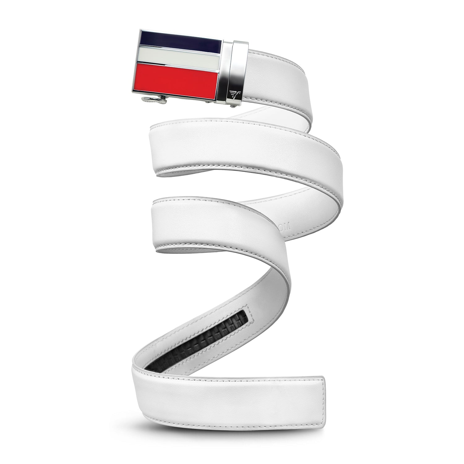 We're putting fireworks where they've never been before. Your waistband is keeping pace with Betsy Ross and apple pie in true red, white and blue fashion. White leather recommended, but you're free to express yourself with black, red, or blue leather options.